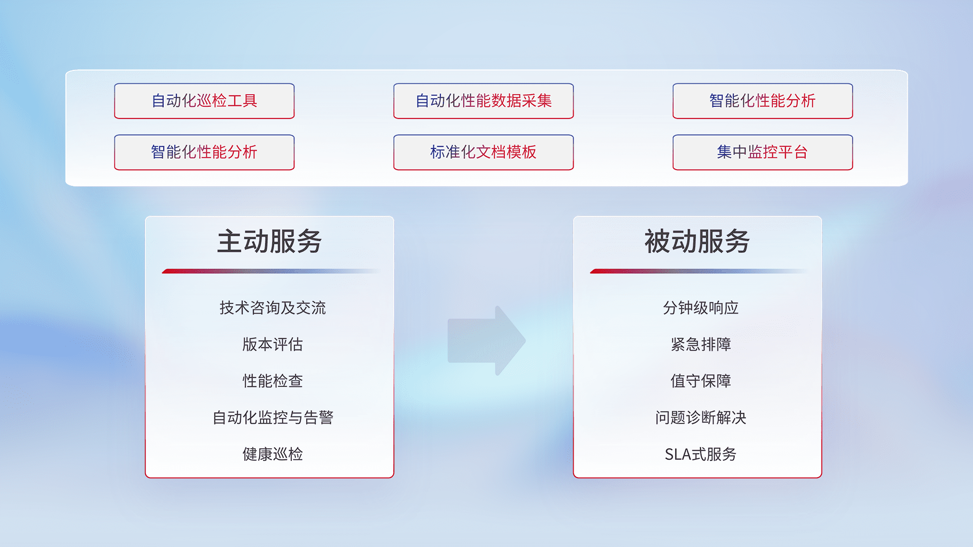 智能化工具和标准化文档,,保障服务质量,,提供主动服务(包含技术咨询、、、版本评估、、性能检查、、、自动化监控与告警、、健康巡检)和被动服务包含(分钟级响应、、、紧急排障、、、值守保障、、问题诊断解决、、、SLA服务)。。。